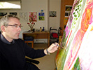 Der einstige Rechtshänder arbeitet jetzt mit Links. Das Bildformat vergrößert sich von 30 x 40 cm auf 80 x 100 cm; das ist die maximale Größe, die er im Rollstuhl sitzend bewältigen kann. In diesem Format überrascht Fabian Wilken durch eine zunehmende Freiheit in der Bildgestaltung. Die Formsprache löst sich vom ursprünglichen Motiv der Natur, wirkt mehr und mehr geschrieben und führt dadurch in einen erhöhten Grad von Abstraktion.